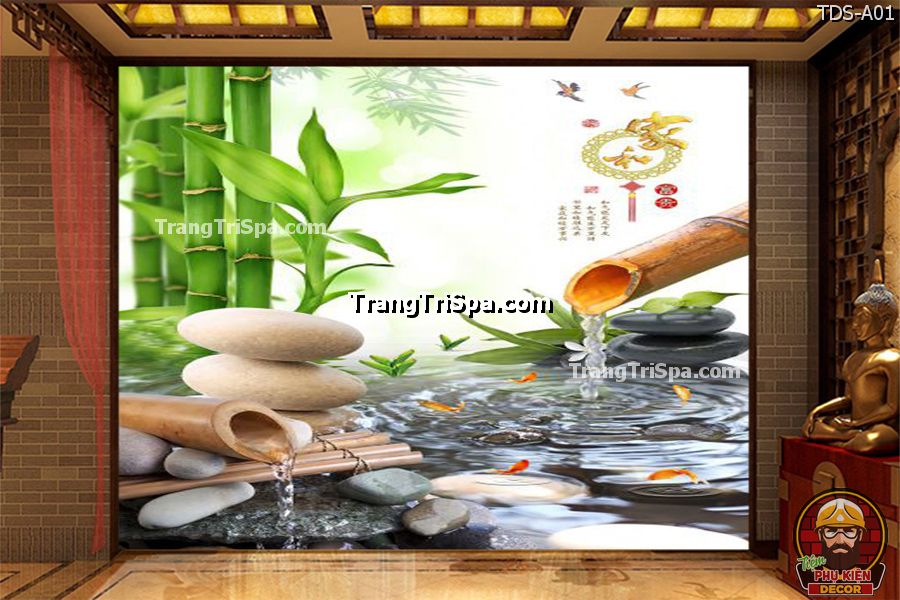 Mẫu tranh dán tường Spa chủ đề Phong cảnh với : cây Tre, cây Trúc, Hoa sen, Đàn cá bơi lội, mang đến một cảm giác thư thái và thanh tịnh